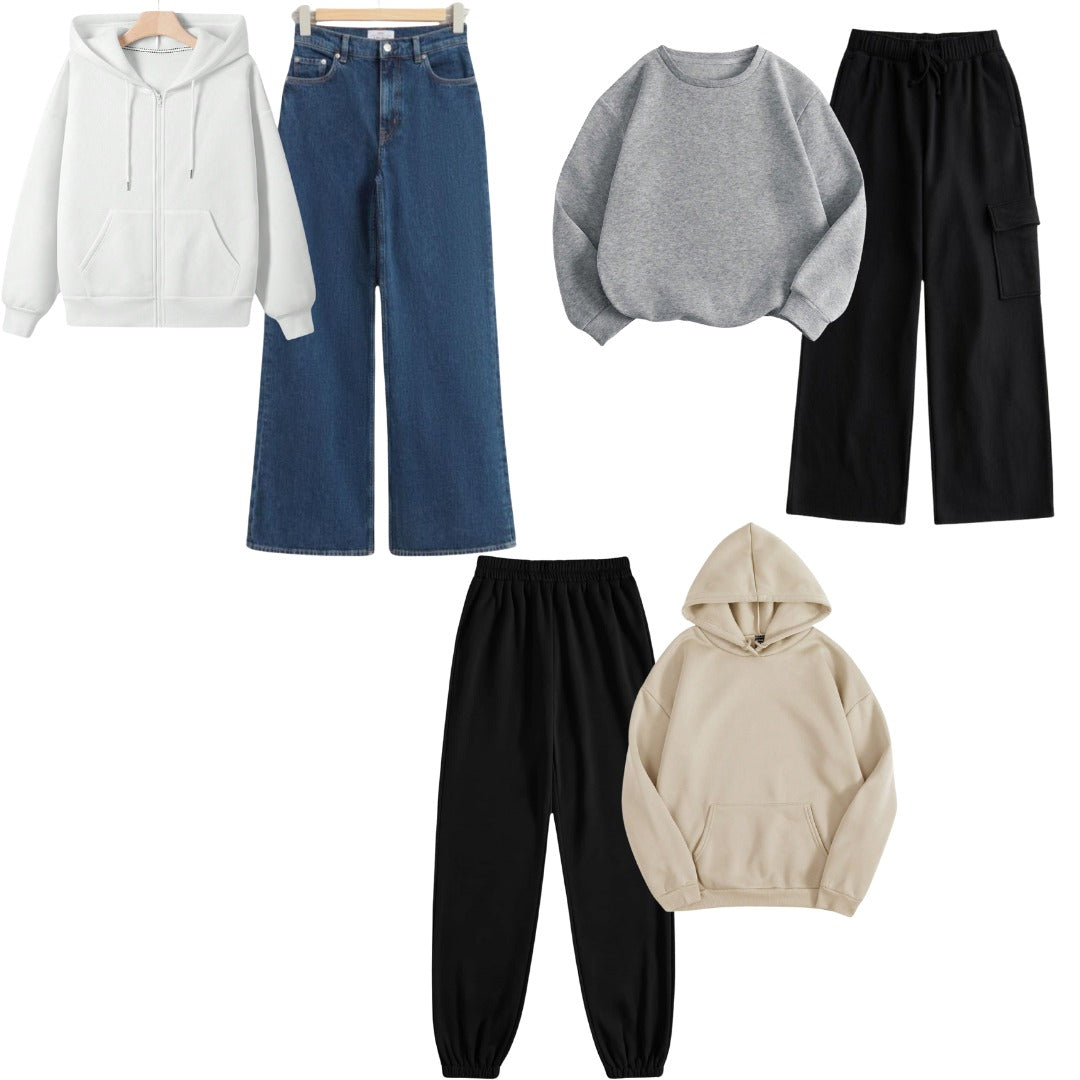 Black Cargo & Sweatapnts- Regular Hoodie in Cream- Sweatshirt in Light Grey- Zipper in White & Dark Blue Jeans